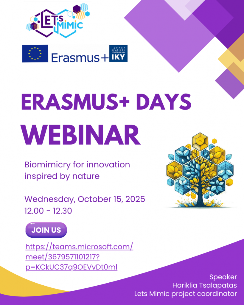Project Let’s Mimic organises a webinar in the context of Erasmus+ Days 2025, a pan-European initiative for celebrating and showcasing Erasmus+ research projects funded by the European Commission. The audience will be familiarised with the principles of biomimicry and innovative digital learning tools and resources developed by the project. The webinar will take place on October 15, 2025, from 12.00 to 12.30. Please see the link to connect on the poster. Please see the link to connect to in the attached poster. Please also see the announcement of the webinar on the Erasmus+ Days official program Biomimicry innovation inspired by the wisdom of nature – ErasmusDays .